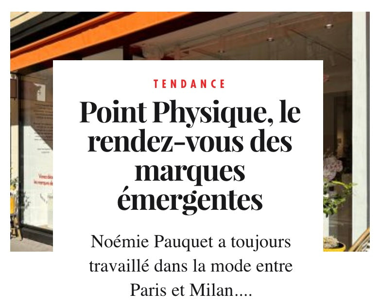 "Bijoux, accessoires, prêt-à-porter… Les créateurs exposent chez Point Physique.Ce concept-store qui change de sélection régulièrement sous l'oeil expert de Noémie permet à des jeunes marques de se lancer. À nous de les dénicher avant qu'elles deviennent très connues !"