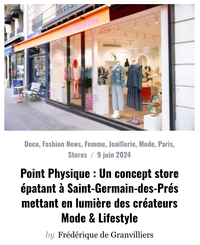 "CONCEPT-STORE POINTU, Au coeur de Saint-Germain-des-Prés, Point Physique mêle mode, joaillerie et déco dans un espace épuré. Chaque semaine, une sélection affütée met a l'honneur des jeunes créateurs du monde entier, souvent présents pour raconter leurs pièces."